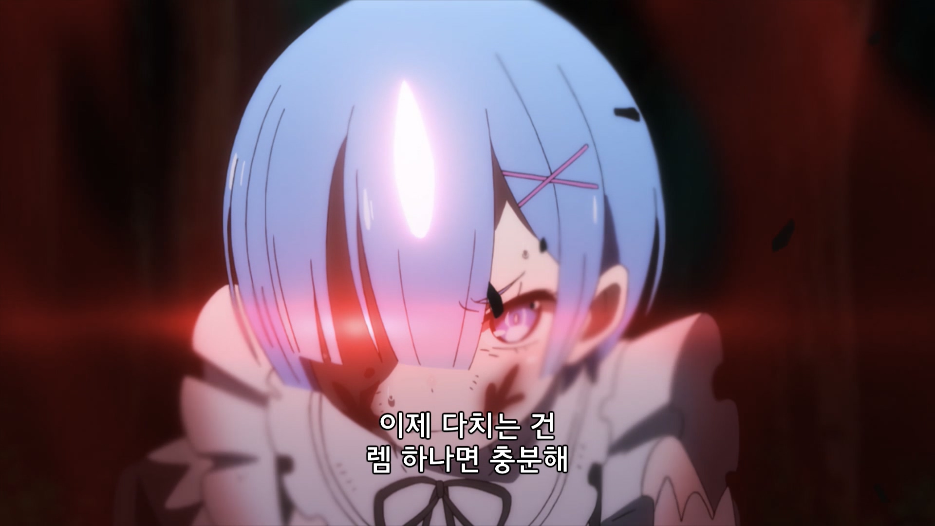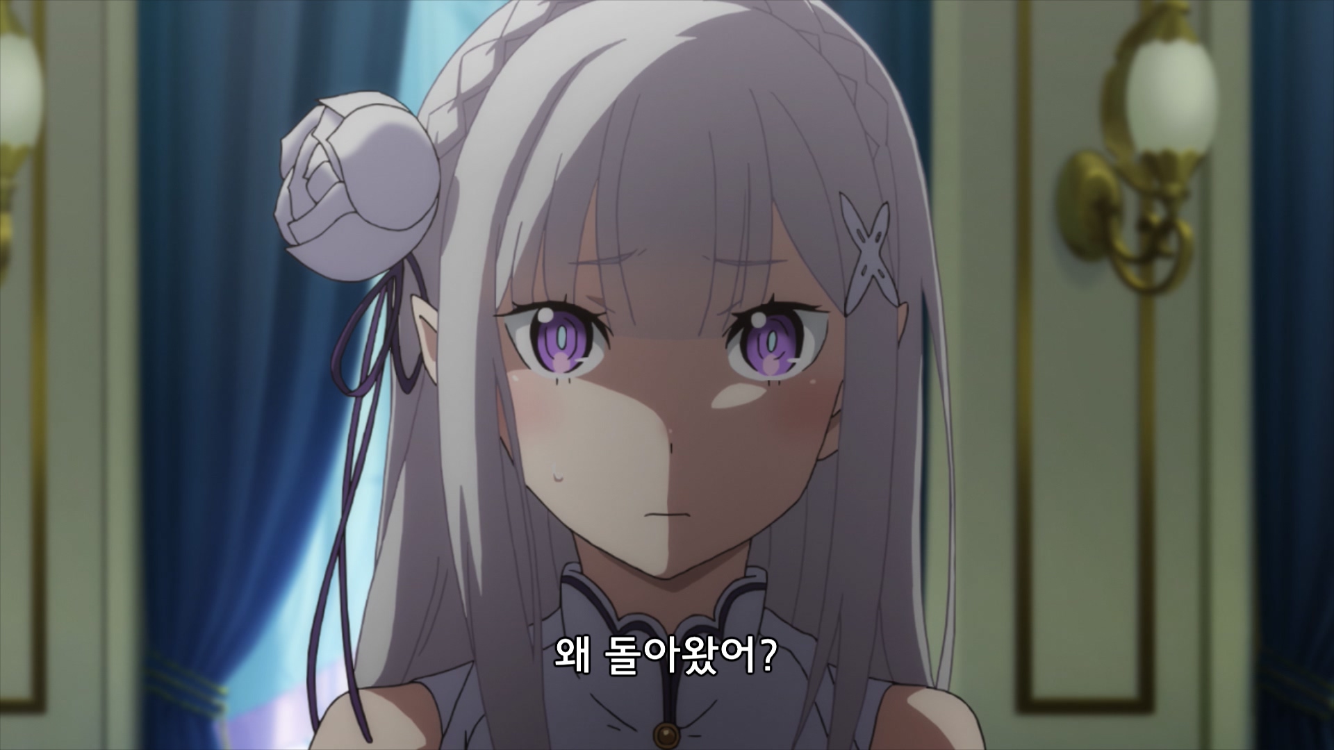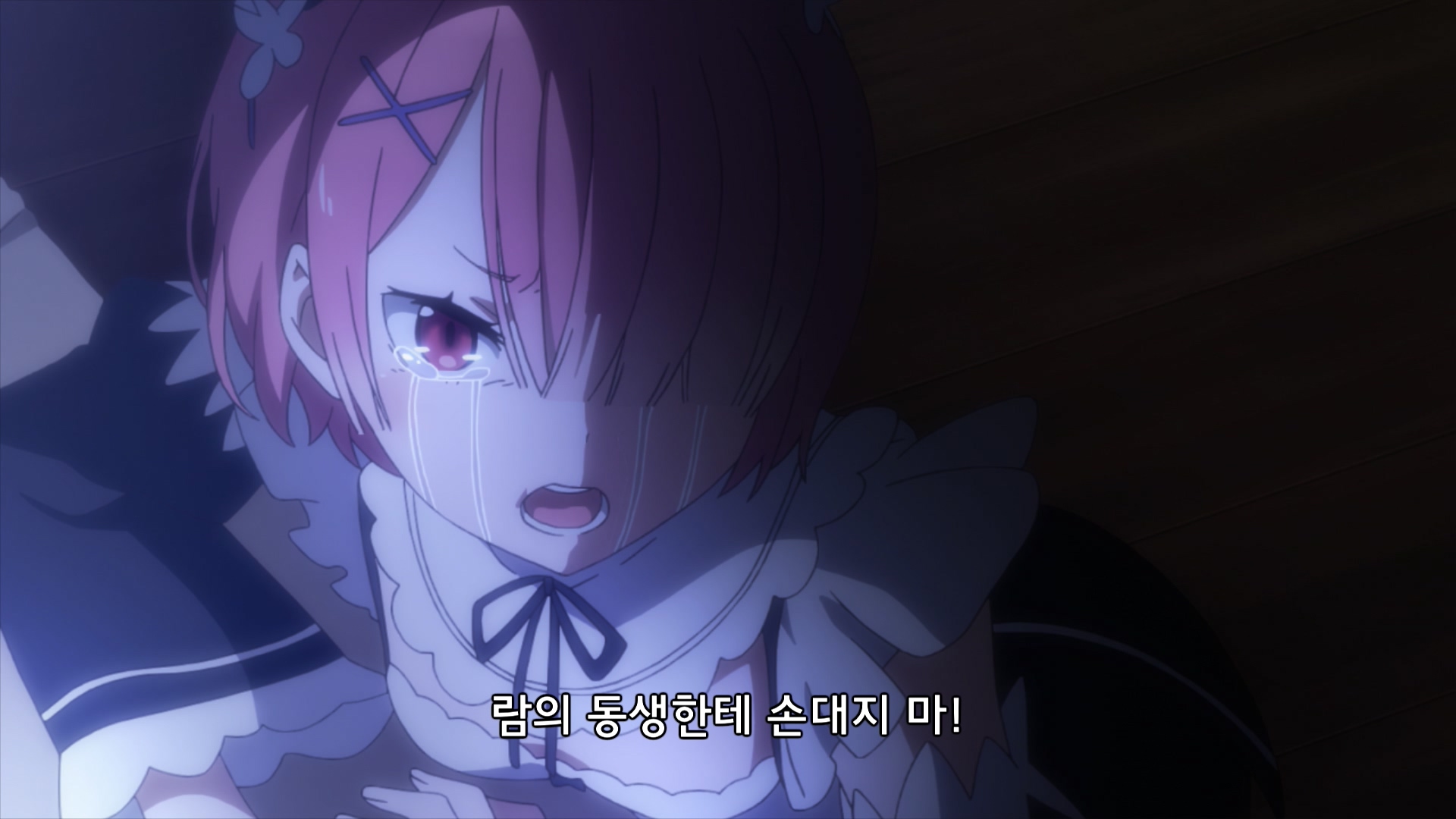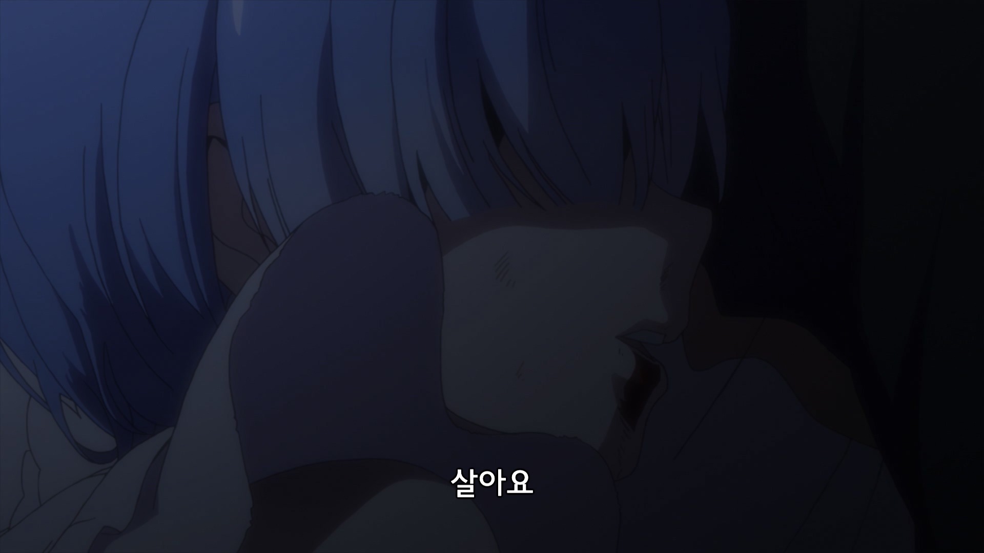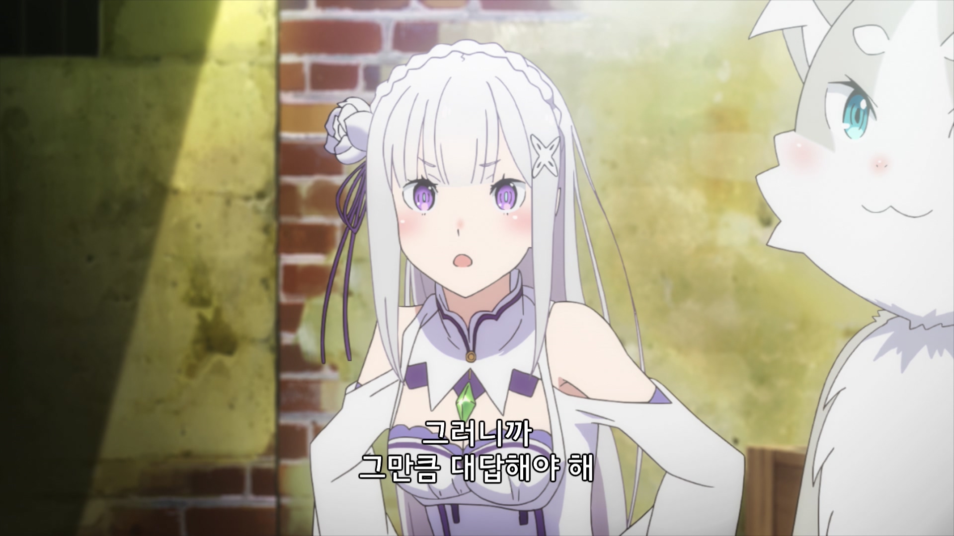 리제로를 보기 전에는 리제로하면 렘이라는 말을 많이 들었어서 렘이 타이틀 히로인인줄 알았는데 실제로 시청하니 사실 에밀리아가 타이틀 히로인 이었다는 사실에 약간 충격을 먹었던 기억이 있습니다. 초반부를 볼 때 까지만 해도 '타이틀 히로인(에밀리아)이 제 구실을 못하는것이 아닌데 어떻게 서브 히로인(렘)이 훨씬 인기가 많지?'라고 생각했었는데, 이에 대한 해답은 바로 이 장면과 후술할 장면에서의 임팩트가 너무 컸던게 아닐까... 생각합니다.