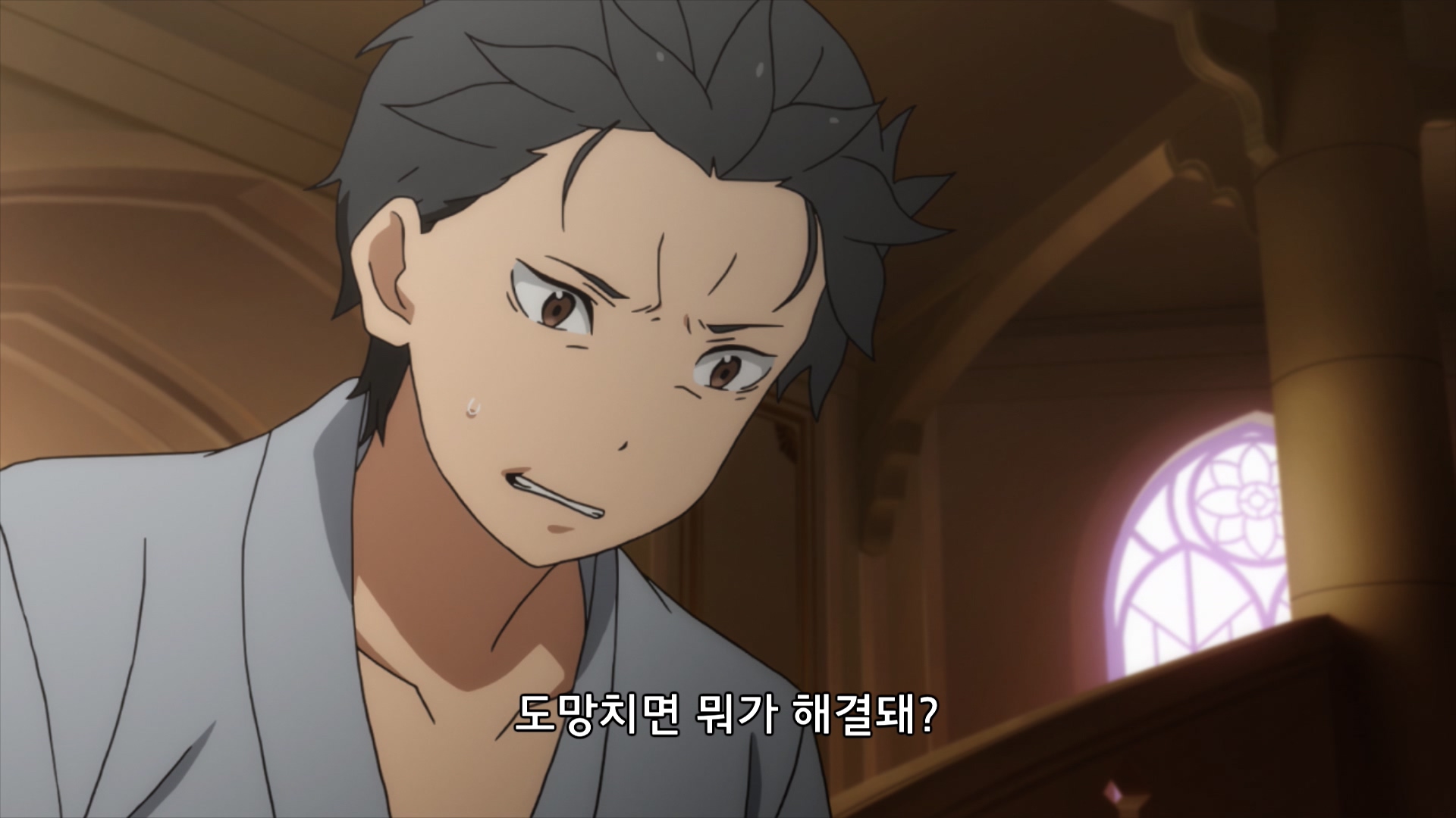솔직히 필자 본인도 이 장면, 그리고 이후 장면에서 나오는 스바루의 추태를 지켜보며 정말 봐주기 힘든 작품이라고 생각했습니다. 시청자로 하여금 보기 괴로울 정도로 스바루가 찌질함의 극치를 보여주거든요. 이 시기쯤 해서 하차하시는 분들이 꽤 있다고 들었을 정도입니다. 하지만 참고 보다보면 주인공이 본인이 처한 역경을 극복하는 과정에서 자신의 문제점을 깨닫고, 자신이 모든 것을 떠안고 직접 강해져서 문제 해결을 하기 보다는 당장 전력에 필요한 조력자들을 찾아다니며 일일이 부탁하는 모습을 보며, 개인적으론 인간으로써 한 단계 성장했다는 것을 보여줘 성장드라마같은 소년물에 가깝다고 느껴졌기 때문에 작가가 무슨 의도로 이렇게 연출 했는지는 이해가 되었습니다만, 그럼에도 주인공 대우가 개차반이라고 생각 되기도 하는 싱숭생숭한 느낌입니다.