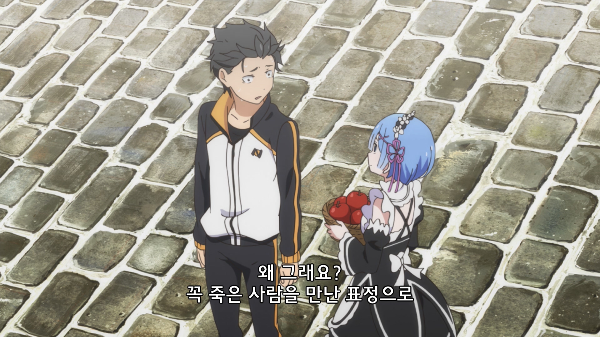 대부분의 이세계물은 특정 사건을 계기로 이세계로 전이하게 됩니다. 다른 이세계물에서는 이러한 점이 확연히 드러나는데요. 예를 들어 코노스바의 주인공인 사토 카즈마는 차에 치이지도 않았는데 치인걸로 착각해서 쇼크사를 했고 그래서 사망한 뒤 이세계로 오게되며, 무직전생의 주인공인 루데우스는 사람을 구하려다 트럭에 치여서 사망한 뒤 이세계로 오게되는 것에 반해, 리제로의 스타트는 '반드시 구해주겠어' 라고 말하며 바닥에 쓰러져있는 이세계에서의 스바루와 편의점에서 물건을 사고 나오는 현생에서의 스바루가 교차되다가 눈을 감고 뜨니 이세계로 오게 되었다는 점. 자의가 아닌 타의로 이세계로 전이했다는 점은 타 작품들과 비슷하지만 특정 사건을 계기로 전이하지 않았다는 점이 개인적으로 앞으로의 전개가 어떻게 될지 흥미롭게 지켜볼 수 있던 장면 중 하나였습니다.