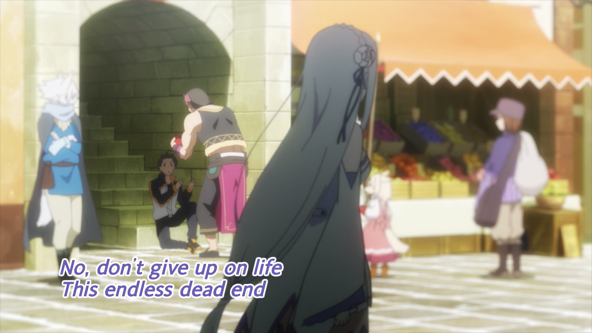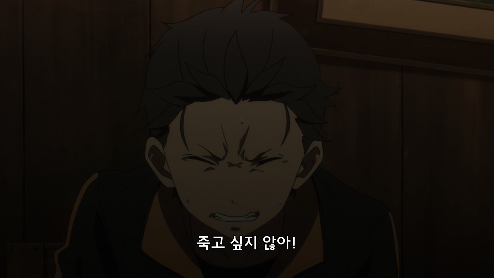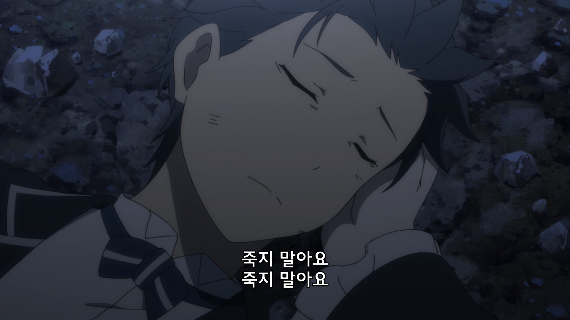 보통 루프물이라고 하면 반전을 이유로 작품 후반부에 드러나는 경향이 짙습니다. 예를 들고 싶지만 그 작품에 대한 스포일러가 될 수 있어서 예를 들지는 못할 거 같네요. 아무튼, 리제로에서는 첫 화부터 대놓고 루프물이라는 것을 보여줬습니다. 처음 제목을 들을때는 아무 느낌도 없지만 이 장면을 보고나선 작품 제목부터 이러한 점을 암시했다고 생각할 수 있습니다. 이세계에서 다시 새출발 한다는 것이 아닌 죽음으로부터 다시 시작한다는 것을 암시했죠. 이러한 것들을 첫화에 모조리 때려박으니 다음화가 궁금해서 미칠 지경이었습니다.