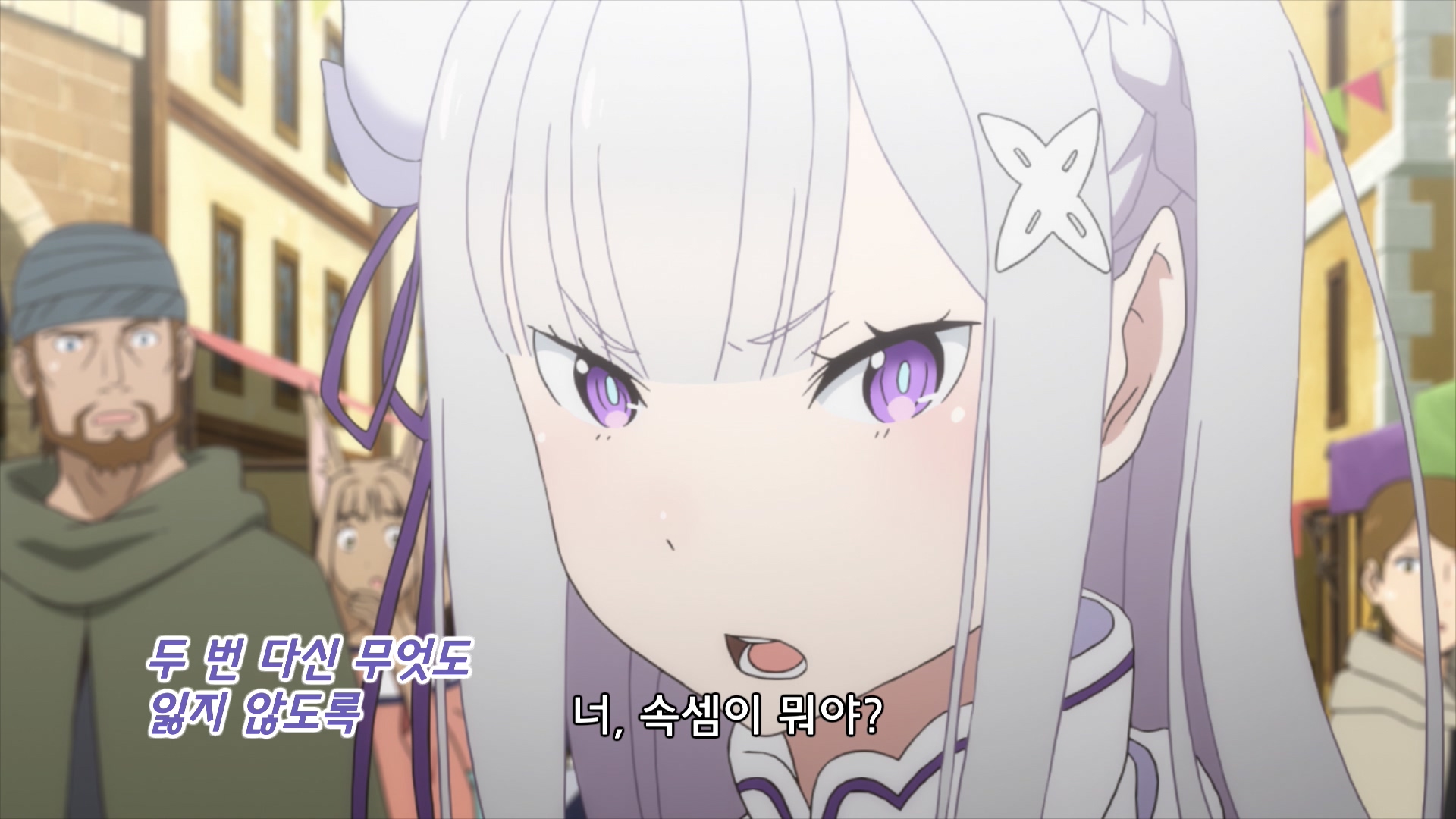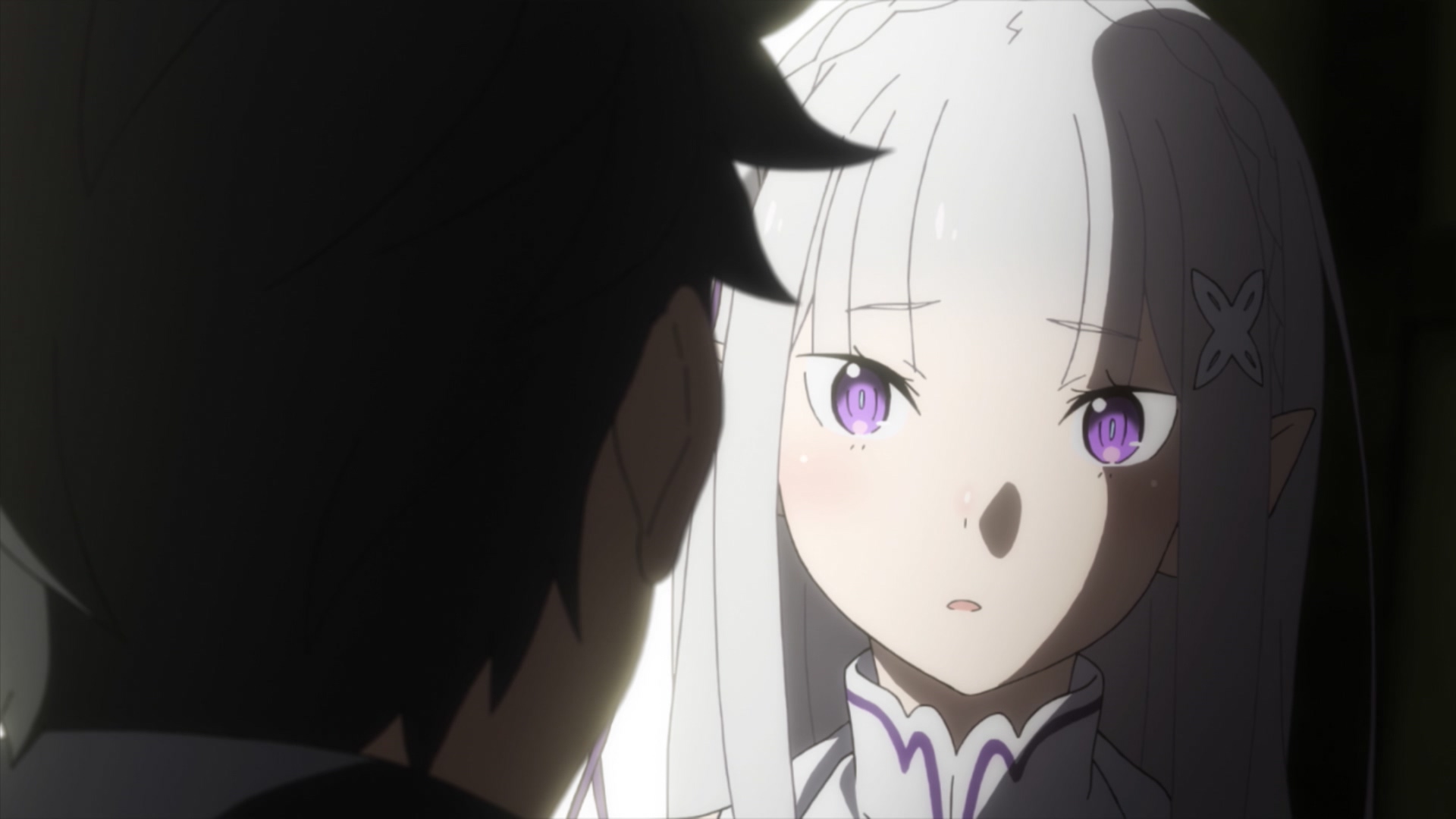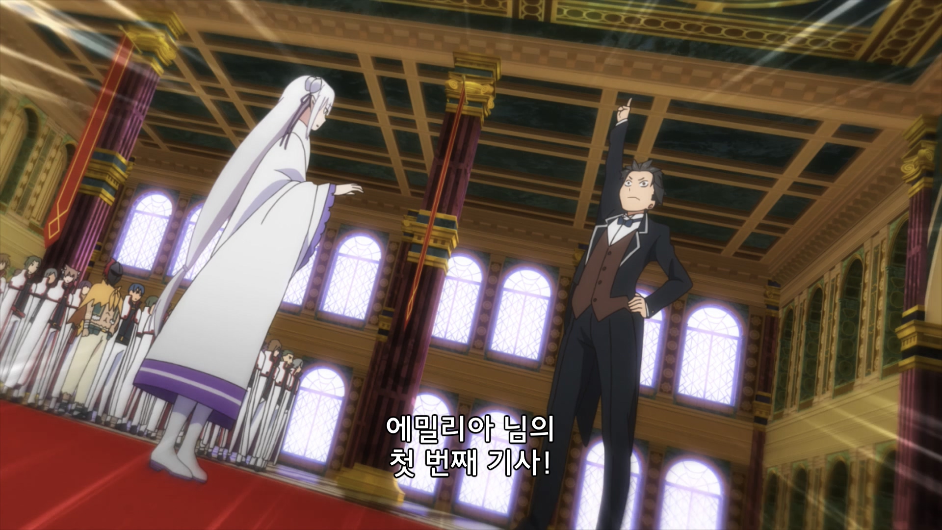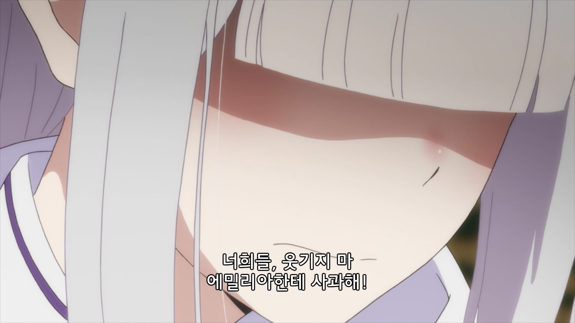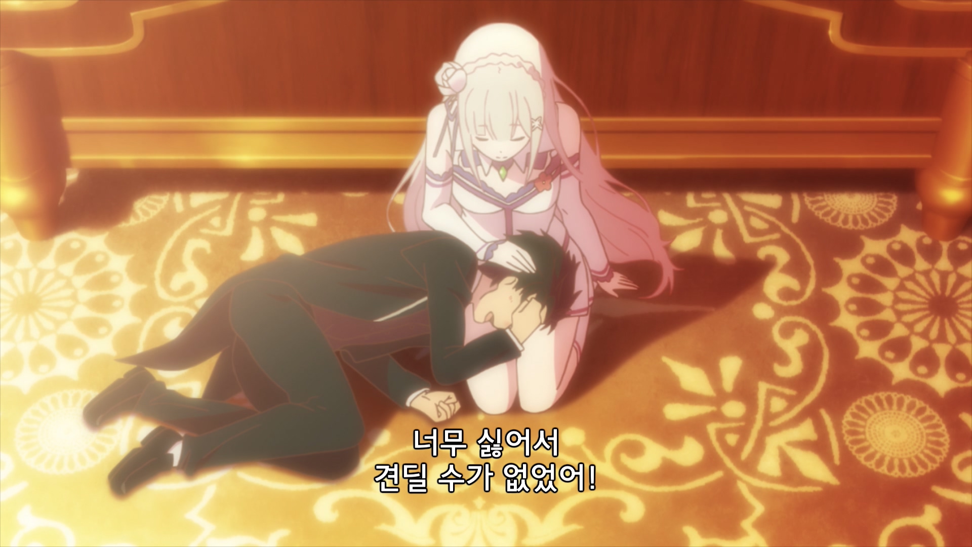 리제로를 보기 전에는 리제로하면 렘이라는 말을 많이 들었어서 렘이 타이틀 히로인인줄 알았는데 실제로 시청하니 사실 에밀리아가 타이틀 히로인 이었다는 사실에 약간 충격을 먹었던 기억이 있습니다. 초반부를 볼 때 까지만 해도 '타이틀 히로인(에밀리아)이 제 구실을 못하는것이 아닌데 어떻게 서브 히로인(렘)이 훨씬 인기가 많지?'라고 생각했었는데, 이에 대한 해답은 바로 이 장면과 후술할 장면에서의 임팩트가 너무 컸던게 아닐까... 생각합니다.