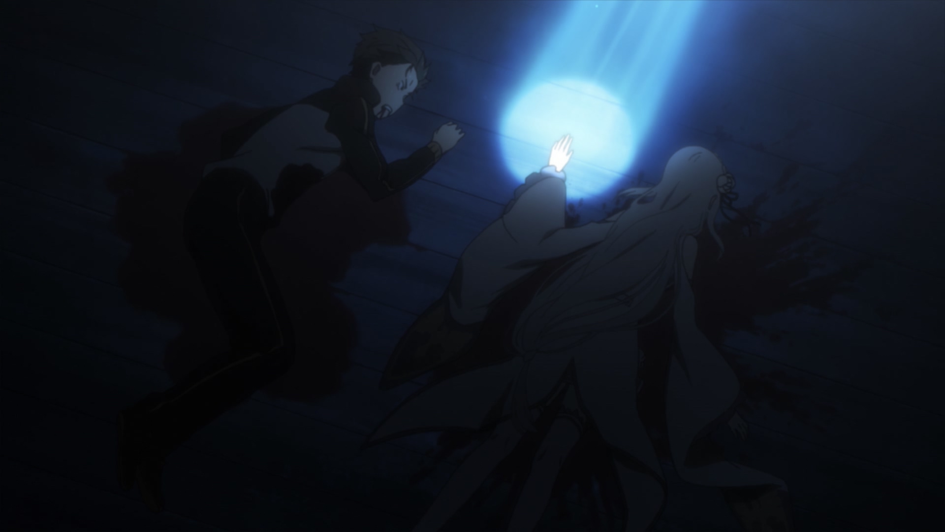 에밀리아가 자신의 이름을 사테라라고 소개했을때 팩의 반응을 보면 당연하게도 사테라가 좋은뜻이 아니라는것은 이전에 나왔던 장면에서 유추할 수 있었습니다만 이러한 장면을 한편의 마무리에 배치하면서 엔딩곡이 BGM으로 흘러나오면서 자연스럽게 다음 장면이 궁금하게끔 하는 연출. 즉, 장면의 배치가 매우 훌륭했다고 할 수 있겠습니다. 그리고 질투의 마녀가 그들에게 있어 무슨 뜻으로 의미되고 있는지 또한 궁금하게 만드는 장면의 배치였다고 생각합니다.