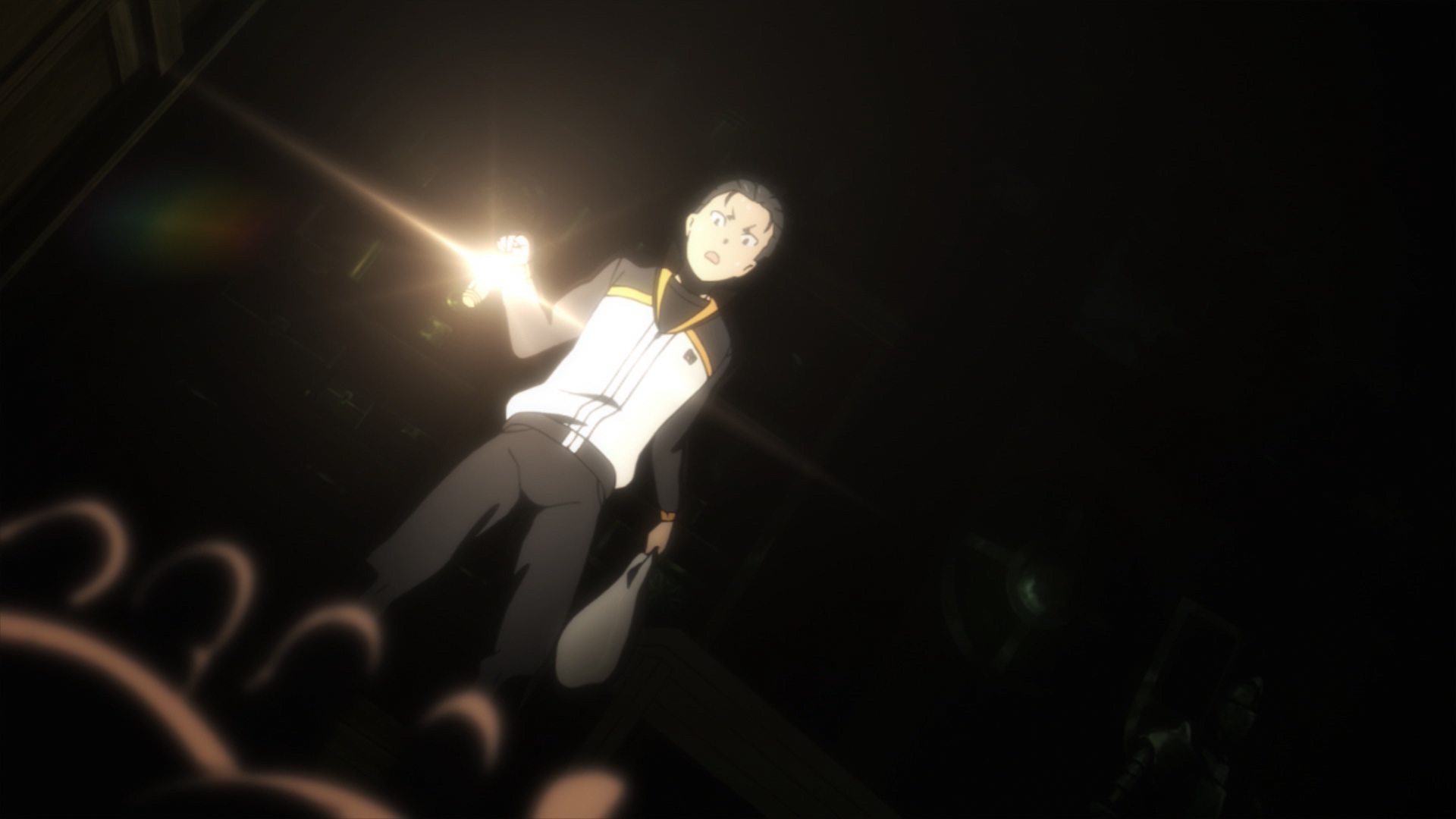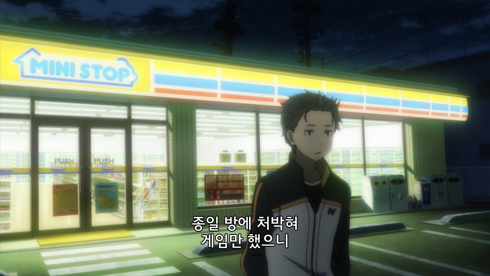 대부분의 이세계물은 특정 사건을 계기로 이세계로 전이하게 됩니다. 다른 이세계물에서는 이러한 점이 확연히 드러나는데요. 예를 들어 코노스바의 주인공인 사토 카즈마는 차에 치이지도 않았는데 치인걸로 착각해서 쇼크사를 했고 그래서 사망한 뒤 이세계로 오게되며, 무직전생의 주인공인 루데우스는 사람을 구하려다 트럭에 치여서 사망한 뒤 이세계로 오게되는 것에 반해, 리제로의 스타트는 '반드시 구해주겠어' 라고 말하며 바닥에 쓰러져있는 이세계에서의 스바루와 편의점에서 물건을 사고 나오는 현생에서의 스바루가 교차되다가 눈을 감고 뜨니 이세계로 오게 되었다는 점. 자의가 아닌 타의로 이세계로 전이했다는 점은 타 작품들과 비슷하지만 특정 사건을 계기로 전이하지 않았다는 점이 개인적으로 앞으로의 전개가 어떻게 될지 흥미롭게 지켜볼 수 있던 장면 중 하나였습니다.