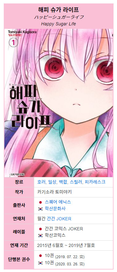 백합이라는 소재보다 스릴러의 성향이 강한 '해피 슈가 라이프'는 12화 완결이라는 짧은 러닝타임 속에 선정적인 요소들로 인하여 꽤 흡입력이 강한 애니메이션입니다. 스토리도 암울하기 짝이없고 작품에 등장하는 어떤 캐릭터 또한 희망이 존재하지 않아 러닝타임은 비록 7시간 남짓한 짧은 시간이지만, 본인의 멘탈이 버티시는 대로 자유롭게 시간배분하여 보시면 될 것 같습니다.